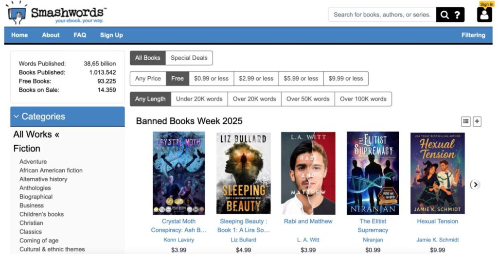 Smashwords è un punto di riferimento per autori indipendenti e lettori alla ricerca di novità. La piattaforma propone titoli freschi e spesso emergenti, scaricabili in vari formati, incluso PDF e EPUB. Consente di filtrare la ricerca per lunghezza del libro e selezionare solo i titoli gratuiti. Attualmente conta oltre 98.000 ebook gratuiti. Ideale per chi ama le nuove voci indipendenti e vuole esplorare senza limiti.