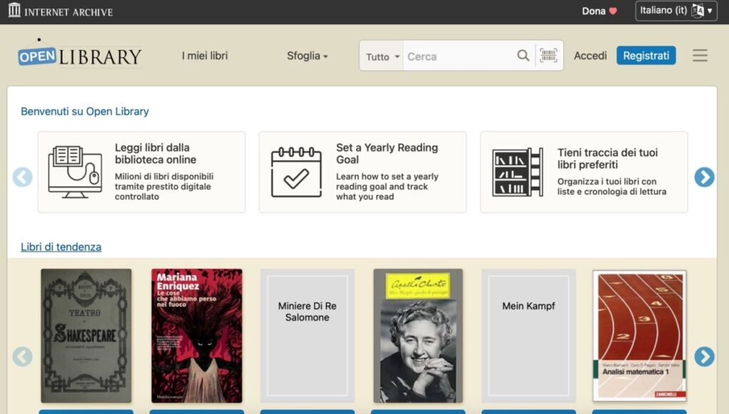 - Open Library: milioni di titoli in prestito, ebook e audiolibri.