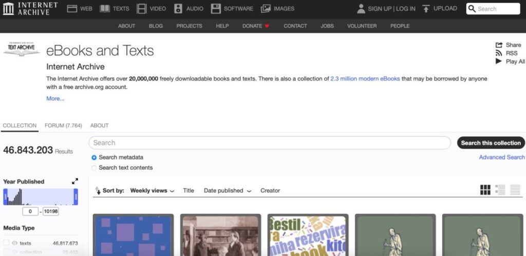 Internet Archive vanta una collezione sterminata con oltre 36 milioni di titoli, oltre a miliardi di pagine web, video, concerti, audio e software. La piattaforma è come una macchina del tempo digitale, con materiali spesso non reperibili altrove. Gli ebook sono organizzati per categoria, autore e anno di pubblicazione e si possono leggere recensioni e valutazioni degli utenti. Registrandosi, si può anche caricare contenuti personali. Il servizio ideale per chi vuole esplorare archivi unici e molto estesi.