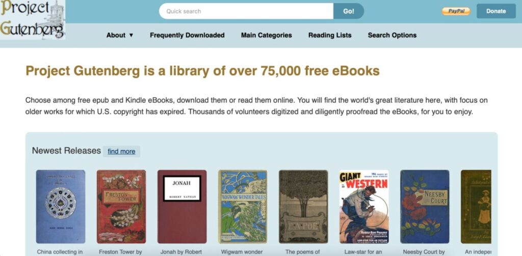 Project Gutenberg è una delle biblioteche digitali più antiche e note, con più di 60.000 ebook gratuiti scaricabili o leggibili online. Non serve un lettore PDF o ebook dedicato per accedere ai contenuti. Il sito organizza i libri per “scaffali” tematici, facilitando la ricerca di argomenti specifici come guerre o musica. È possibile scaricare ebook in diversi formati, anche Kindle, oltre ad audiolibri. Un punto di riferimento per chi ama i classici gratuiti e vuole un’esperienza semplice e versatile.