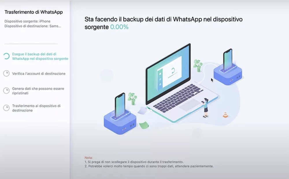 Questo programma può trasferire direttamente da WhatsApp e WhatsApp Business tra un iPhone con sistema operativo iOS ed uno Android senza la necessità di un reset di fabbrica.