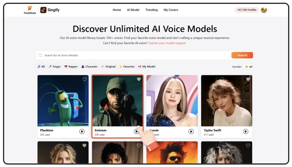 In pratica con Fineshare Singify, gli utenti possono accedere a oltre 100 modelli di voci formati sulla base di dataset variabili, consentendoti così di ricreare lo stile di cantanti famosi o altri individui popolari: La piattaforma permette quindi di far eseguire un brando da un modello di cantante partendo da un audio di un’altro cantante oppure da un brano cantato da noi stessi.