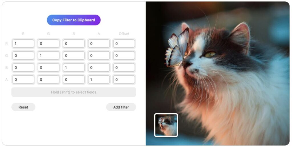 - SVG Color Matrix Mixer: Strumento per combinare filtri colorati SVG, generando effetti cromatici complessi applicabili via CSS in modo visuale.