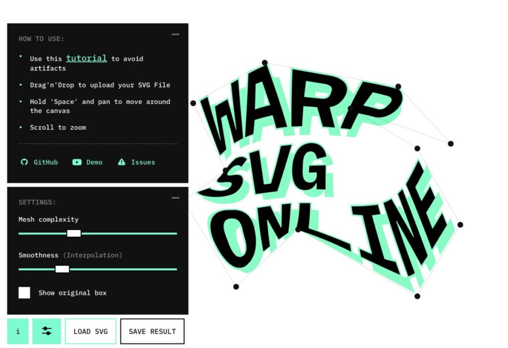 Warp SVG permette di deformare e piegare testi o forme SVG regolando i punti di ancoraggio con opzioni di morbidezza e numero di punti. Offre un’interfaccia visiva facile da utilizzare.
