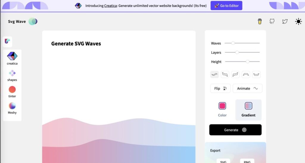 - SVGwave e Getwaves: Generator di onde vettoriali per sfondi o divisori, con personalizzazione di colori e forme e esportazione in SVG o PNG.