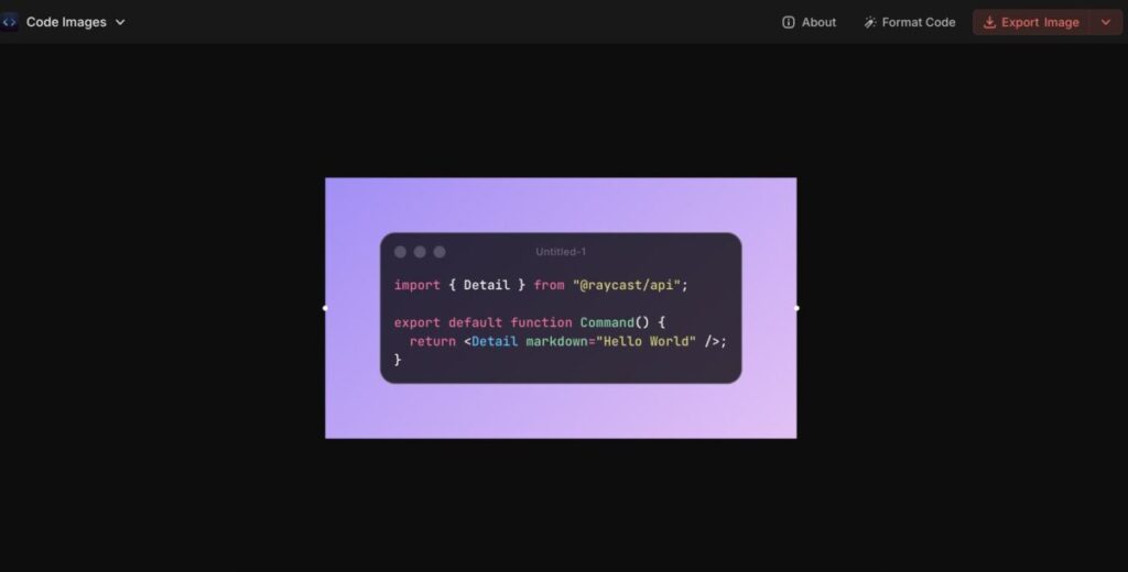 Ray.so genera immagini PNG di alta qualità per la condivisione di snippet di codice SVG o altro codice, con opzioni di tema scuro o chiaro e personalizzazione estetica.