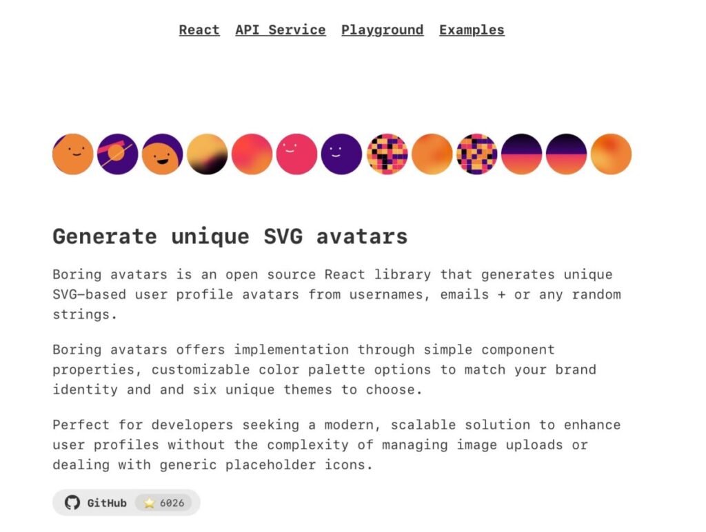 - Boring Avatars: Libreria React per creare avatar SVG rotondi personalizzati da username e palette colori, con diversi stili astratti.
