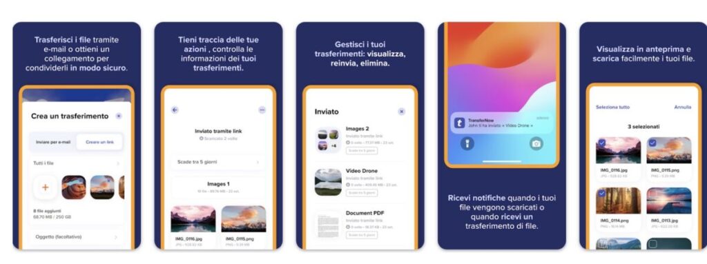 TransferNow è accessibile anche tramite app mobile gratuita per iOS e Android, pensata per chi vuole gestire trasferimenti di file grandi direttamente dal proprio smartphone o tablet. L’app consente di inviare foto, video e documenti con pochi tap, ovunque ci si trovi, senza bisogno di accedere a un computer. Offre un’interfaccia semplice e intuitiva per selezionare i file dal dispositivo, monitorare lo stato degli invii, ricevere notifiche in tempo reale e scaricare i file ricevuti. Inoltre, è possibile collegare l’app al proprio account TransferNow per avere sempre sotto controllo la cronologia degli invii e sfruttare funzioni avanzate come la protezione con password e limiti di download. Questa soluzione rende TransferNow perfetto per professionisti e utenti in mobilità, che necessitano di un trasferimento file veloce, sicuro e senza complicazioni.
