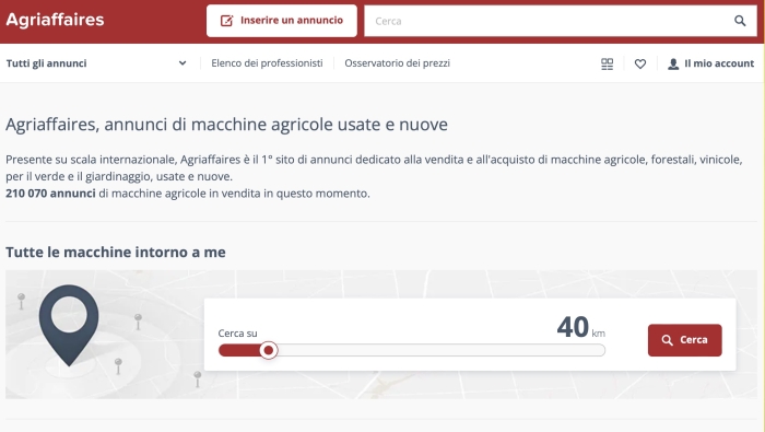 Agriaffaires è un sito web internazionale per l’acquisto e la vendita di macchine agricole usate: trattori, mietitrebbie, trince, seminatrici, aratri, polverizzatori, rimorchi agricoli, macchine per l’allevamento, da fienagione, giardinaggio, macchine forestali e altre macchine agricole. (d.a.)