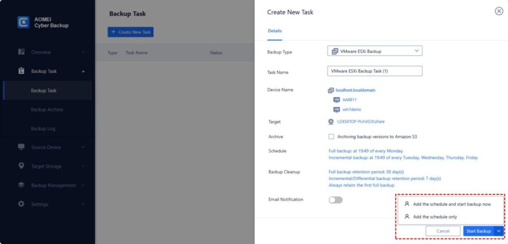 1) Navigare in Compito di Backup > + Crea Nuovo Compito, e selezionare il tipo di backup da Backup VMware ESXi, Backup Hyper-V, Backup Microsoft, Backup Disco o Backup File. Quindi impostare il nome del compito, dispositivo, destinazione, archiviazione e pianificazione.