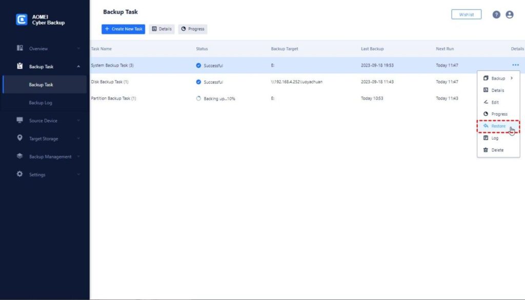Andare in Compito di Backup per localizzare il compito che si desidera ripristinare e fare clic su … > Ripristina.