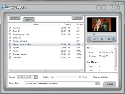 CinemaHD 2.0 converte i video di quasi tutti i formati di origine da uno standard all’altro. L’applicazione supporta la lettura e la conversione di DVD-Video, DVD-singoli capitoli così come formati video AVI, WMV, MP4, 3GP, VOB, MPG (MPEG-1, MPEG-2), MPEG-4 (DivX 3,11-6, Xvid, Nero Digital, ecc) e MJPEG. Cnverte i video-DVD (o di singoli capitoli), così come i file video con pochi clic del mouse in video compressi che sono perfettamente tarato per il vostro dispositivo rispettivo.