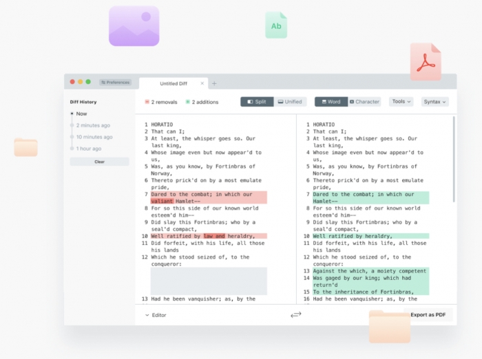 Non finisce qui. perché Diffchecker non si limita a controllare differenze tra due testi da documenti testuali ma supporta differenze anche tra le immagini (pixel per pixel), documenti in formato PDF ed anche tra files in formato Excel