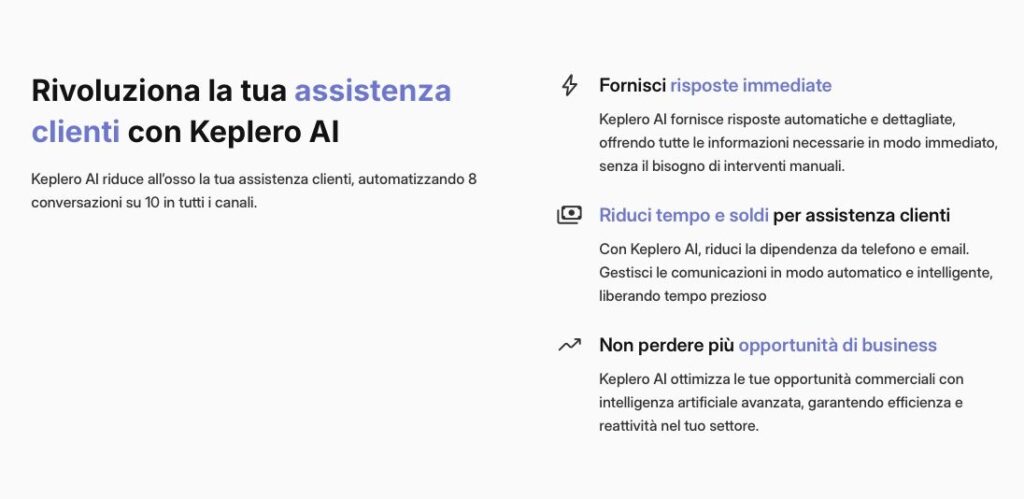 Keplero AI rappresenta uno strumento fondamentale per ottimizzare le relazioni con i clienti. Riduce significativamente i tempi di risposta e i costi legati all’assistenza, migliorando la produttività interna e la soddisfazione degli utenti finali. Automatizzando la maggior parte delle interazioni, previene la perdita di opportunità commerciali che possono nascere da ritardi o mancate risposte tempestive. Inoltre, permette di alleggerire il carico di lavoro del personale, permettendo loro di concentrarsi solo sulle richieste più complesse.