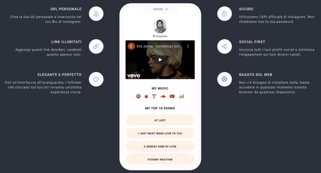 L’utilizzo è rapido e semplice: dopo essersi autenticati tramite Instagram, si possono aggiungere, rimuovere o modificare i collegamenti in qualsiasi momento, senza dover a ogni modifica sostituire l’URL nella propria bio. La piattaforma è web-based, quindi accessibile da qualsiasi dispositivo senza necessità di installare software.